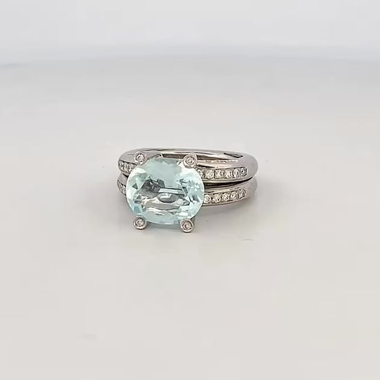 Anillo de la prestigiosa firma de joyería francesa Sillam realizado en oro blanco de 18kt con aguamarina central engastada en 4 grapas con diamantes y en los brazos diamantes talla brillante. Una pieza de alta joyería muy especial.