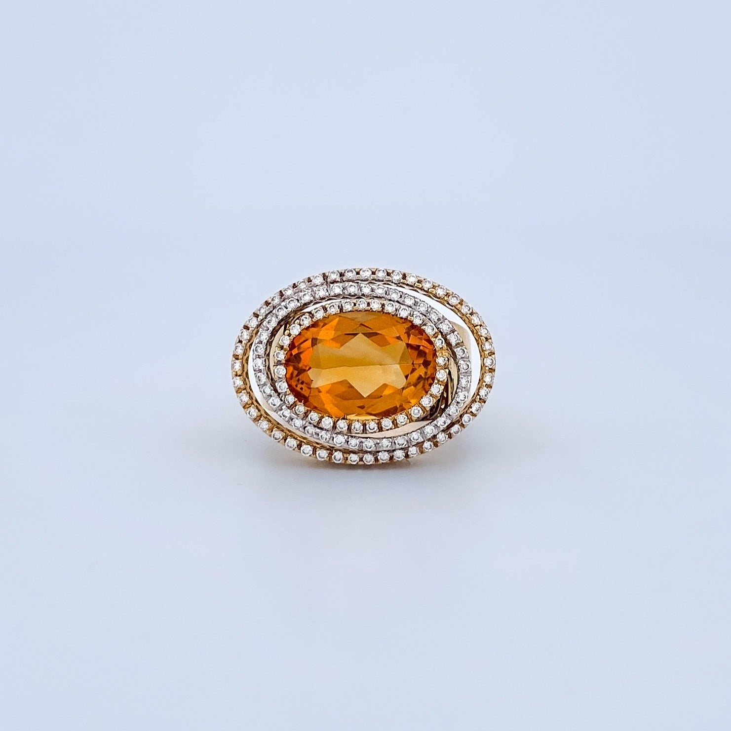Anillo de oro amarillo de 18kt con citrino talla oval central y pavé de diamantes en espiral de la prestigiosa joyería Italiana Ponte Vecchio que se diferencian ya que incorporan “sgriffatura”, una técnica renacentista de perforación para que las gemas brillen mejor, reinterpretada con estilo propio además, el tallo de los anillos incluye un “punto” distintivo para equilibrar sus formas lo que las convierte en joyas únicas y artesanales.