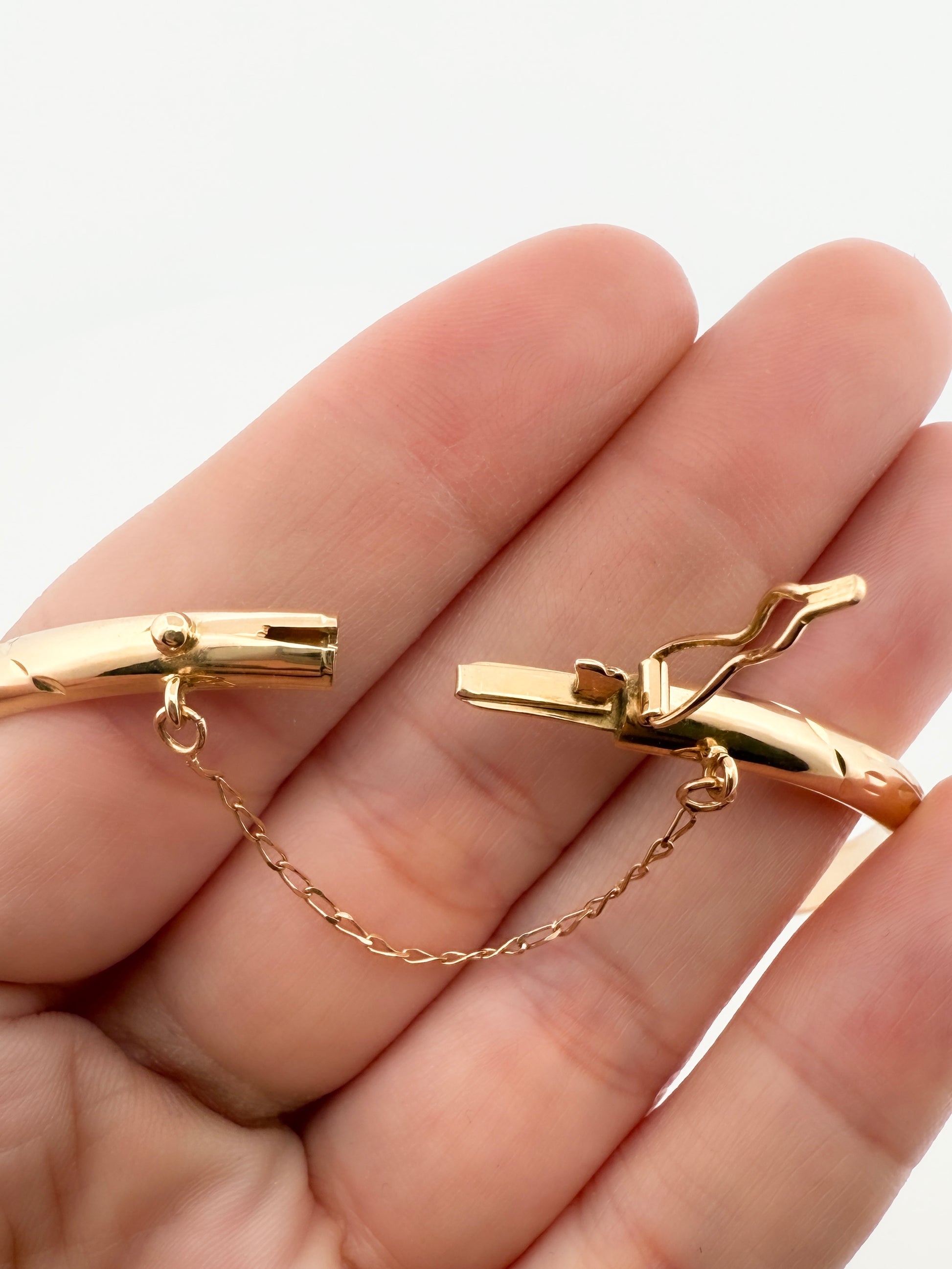Pulsera esclava con grabado en la parte exterior en forma de hojas realizada en oro amarillo de 18kt. Esta preciosa pulsera rígida dispone de cierre de cajón con uny cadena de seguridad,