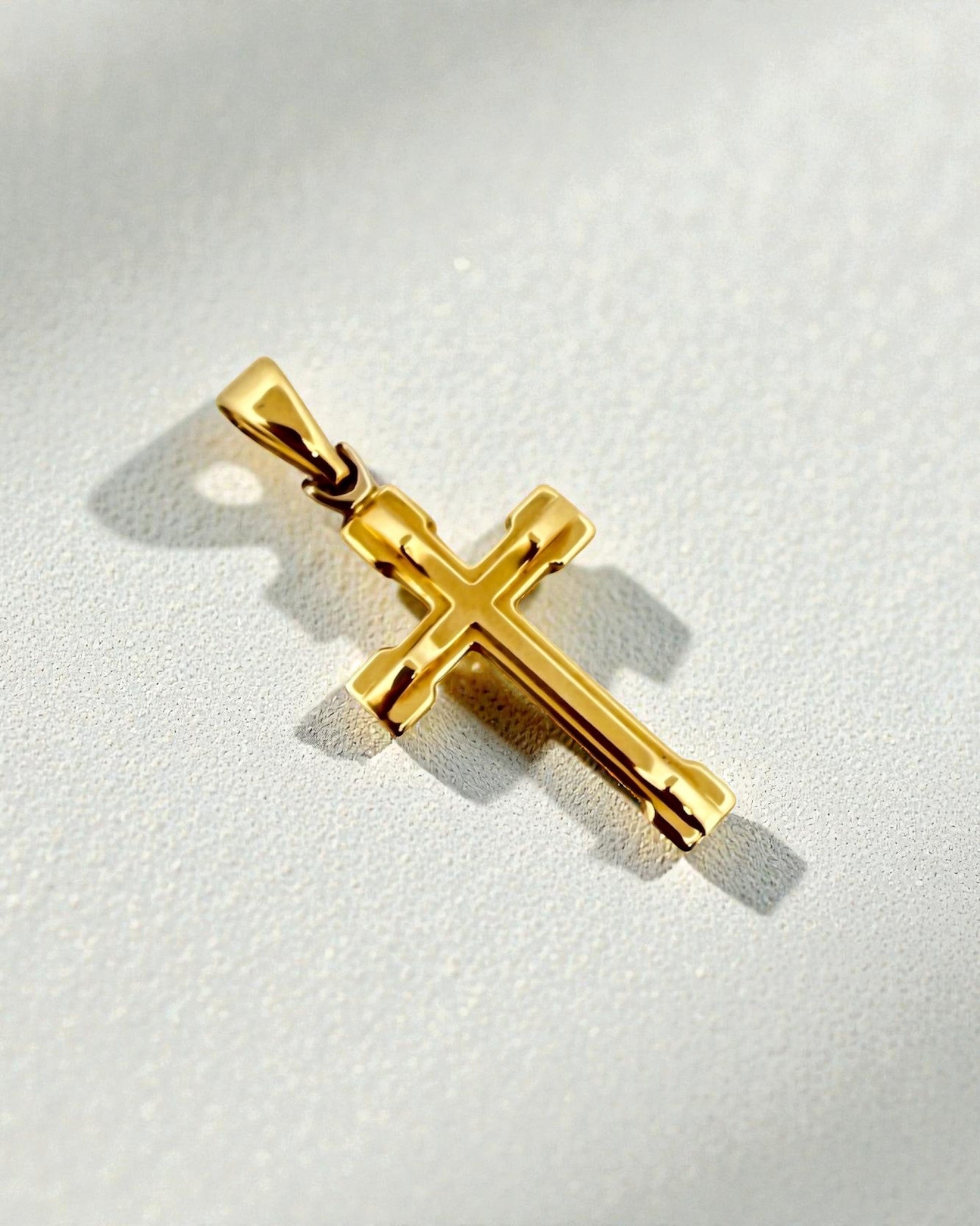 Colgante en forma de cruz con relieve realizada en oro amarillo de 18kt. Mide 3,7cm de largo y 1,6cm de ancho. Este colgante de cruz cruz unisex es precioso para hombre y mujer