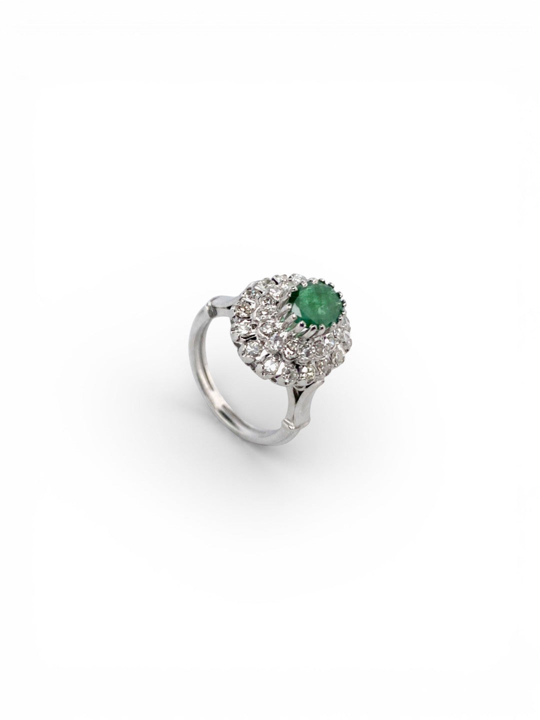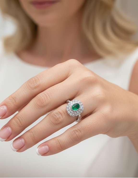 Sortija realizada en oro blanco de 18kt con rosetón de esmeralda talla oval y 2 orlas de brillantes.