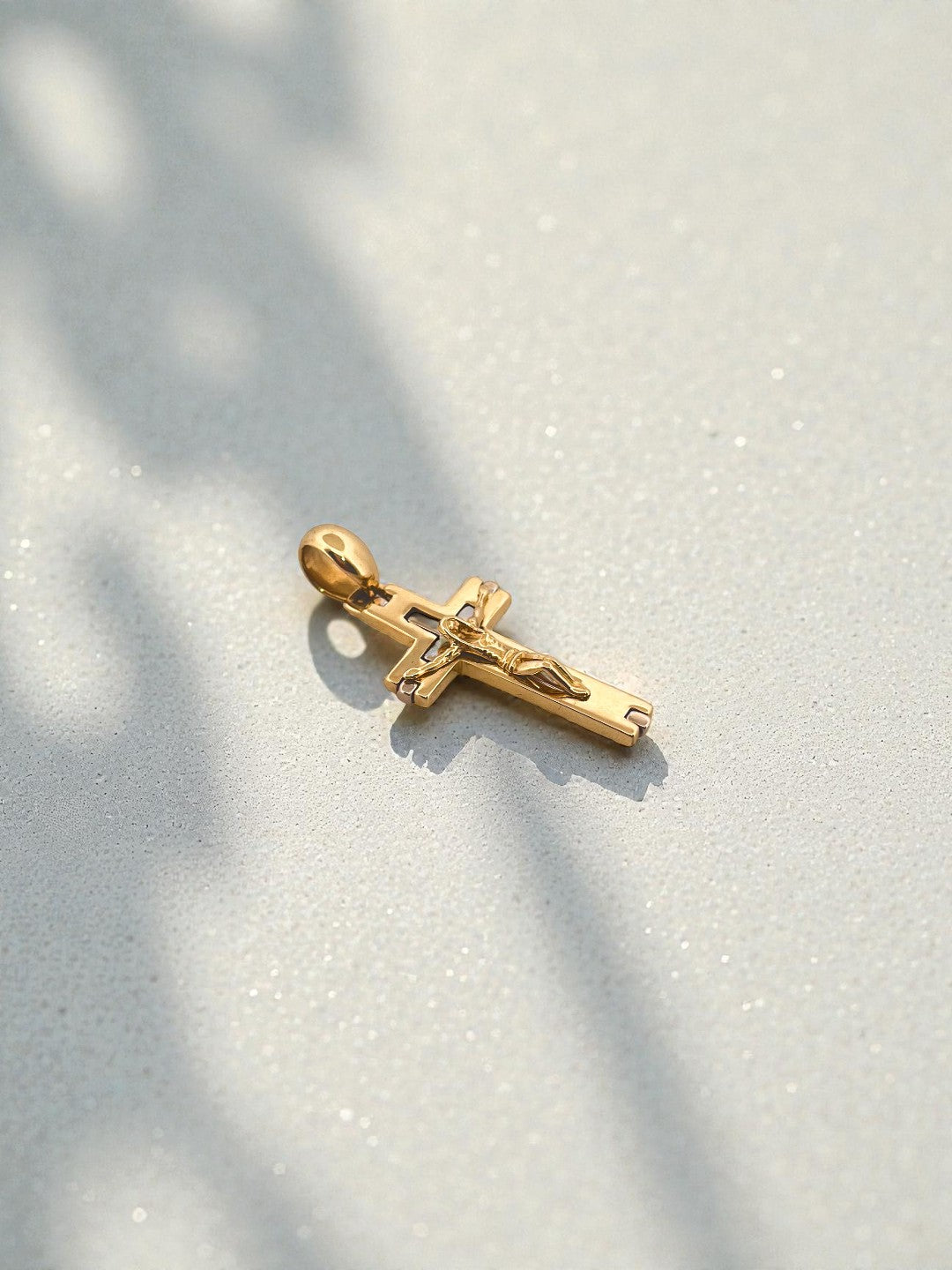Colgante cruz con cristo en oro amarillocon detalle de cruz en oro blanco de 18kt.