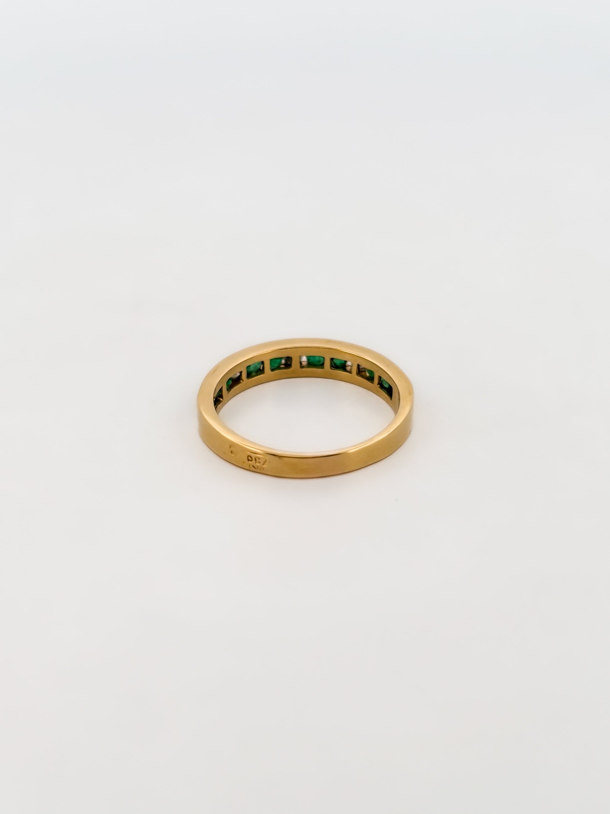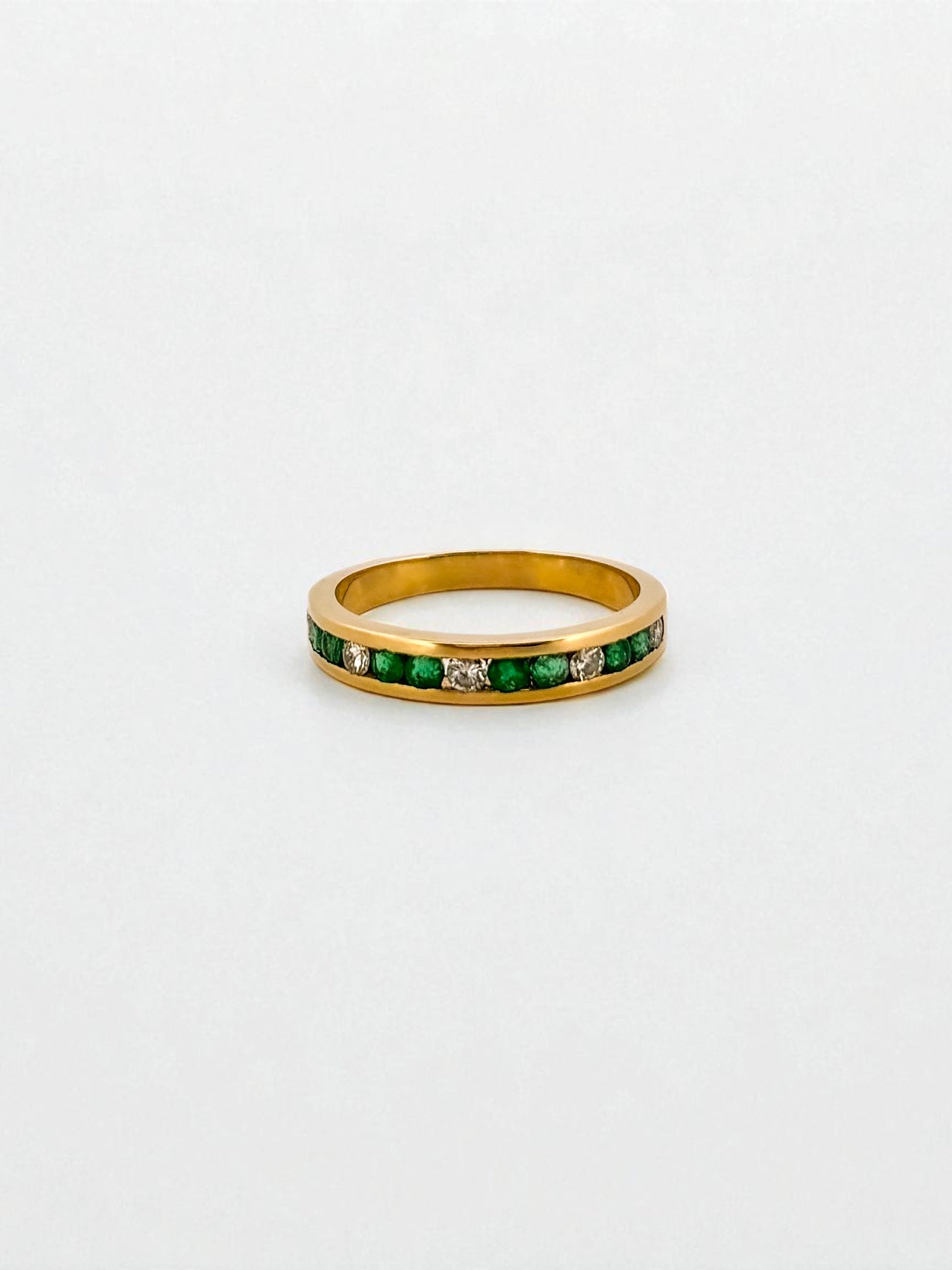 Media alianza de oro amarillo de 18kt con carril de diamantes intercalados con esmeraldas.