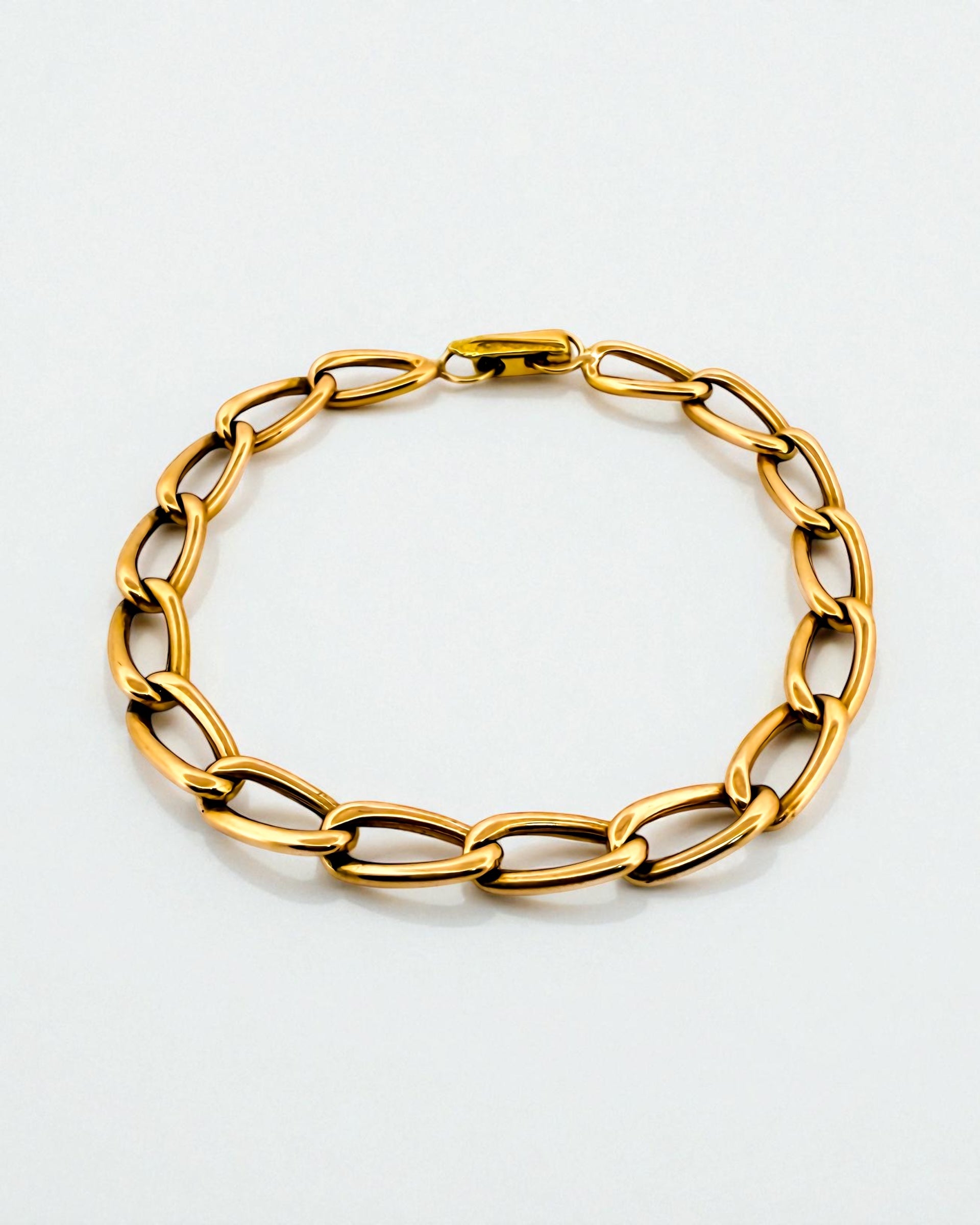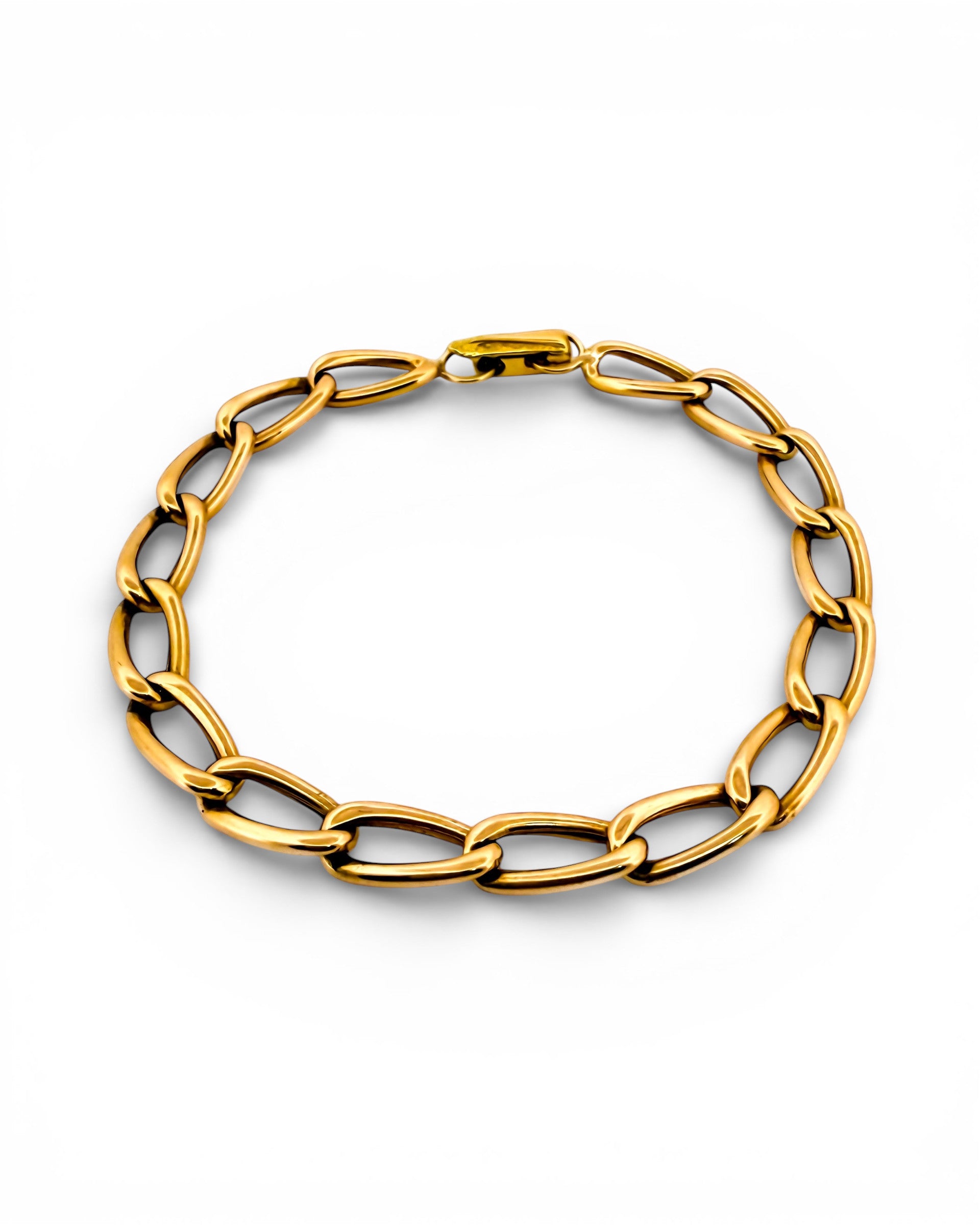 Pulsera de cadena bilbaína en oro amarillo de 18Kt de 19,5cm de largo con eslabones alargados y cierre tipo mosquetón.