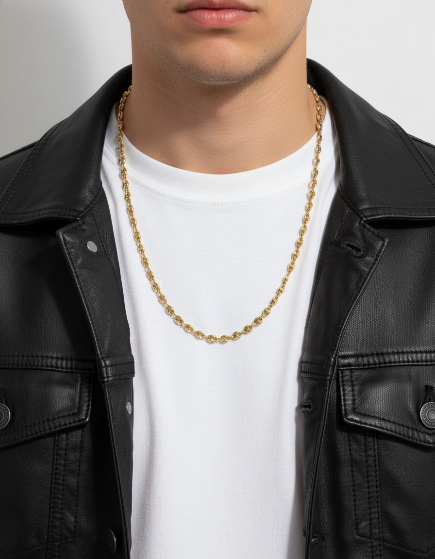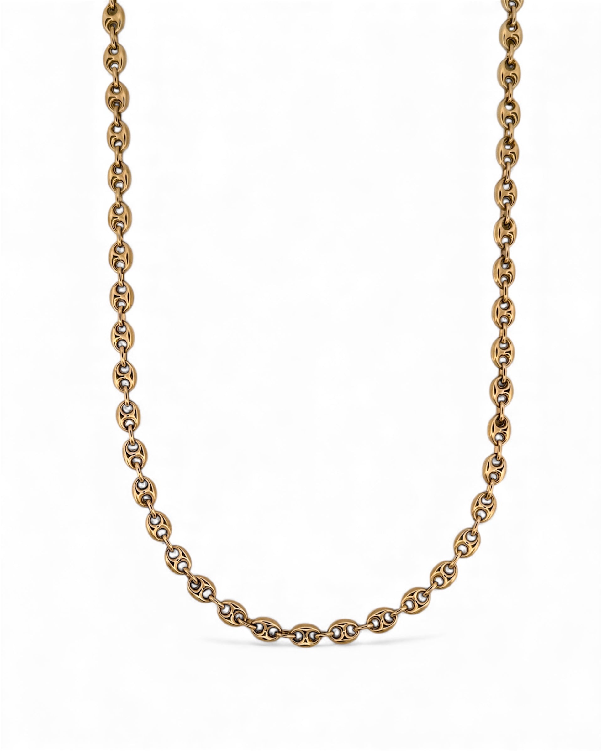 Collar de oro amarillo de 18kt de cadena de calabrote o grano de café. La cadena mide 60,5cm de largo y tiene un grosor de 5,86mm. Dispone de un cierre tipo mosquetón.