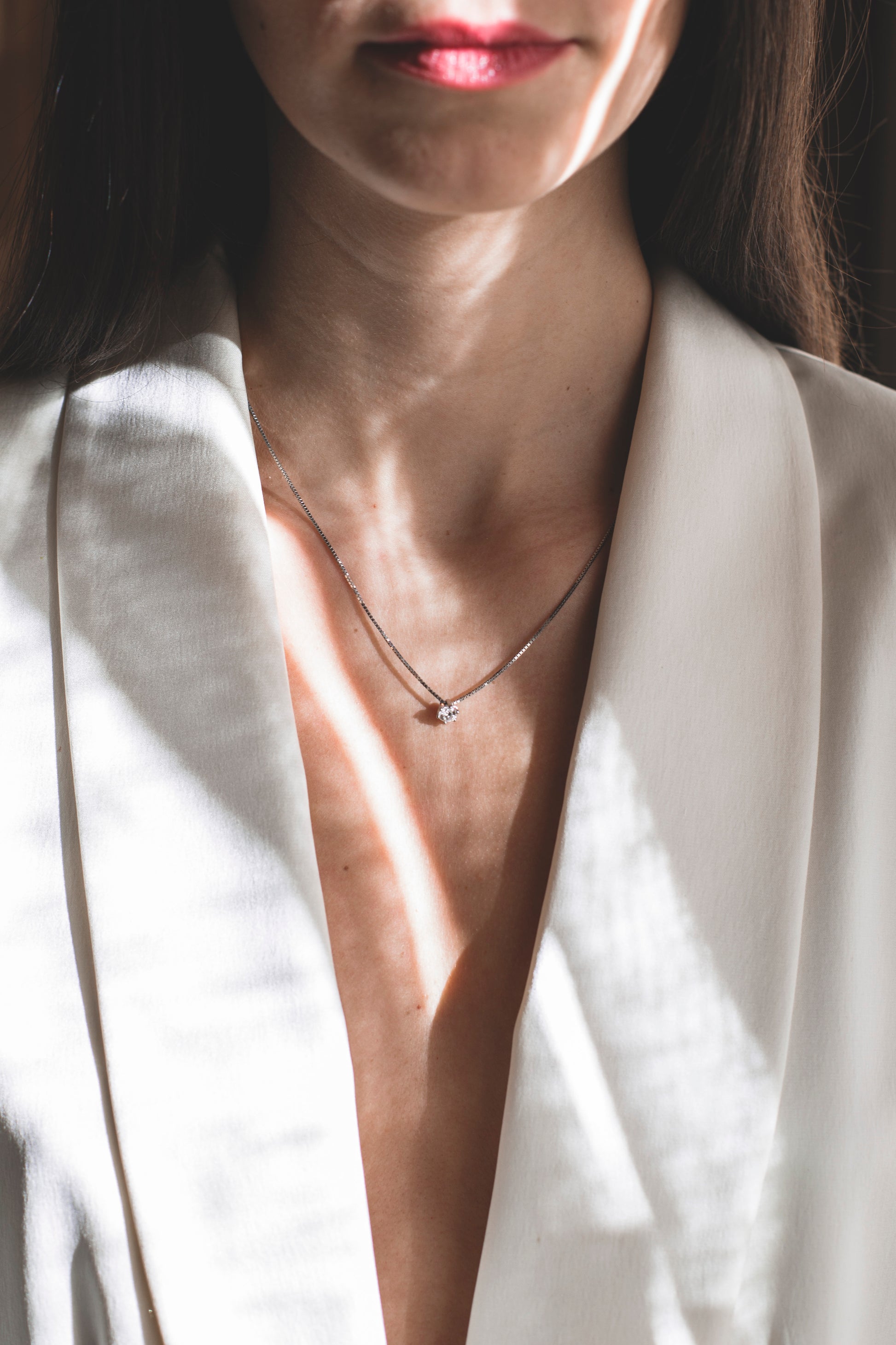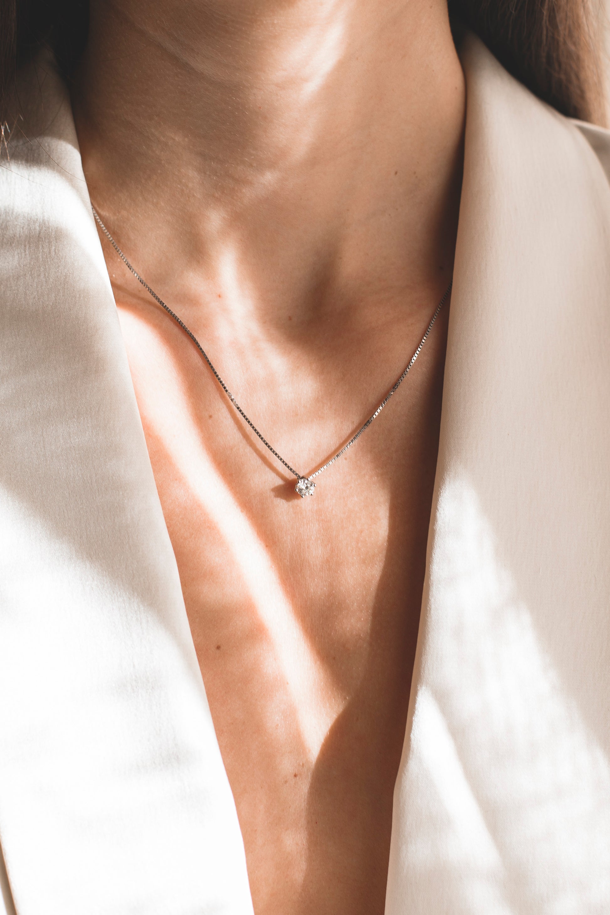 Collar con cadena tipo veneciana en oro blanco de 18kt con un solitario de brillante engastado en 4 grapas. La cadena mide 42cm de largo y dispone de cierre tipo reasa.